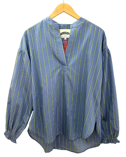 Heerlijke zomerse katoene blouse van The Shirt Project in lichtblauw met gucci green en lurex streep.