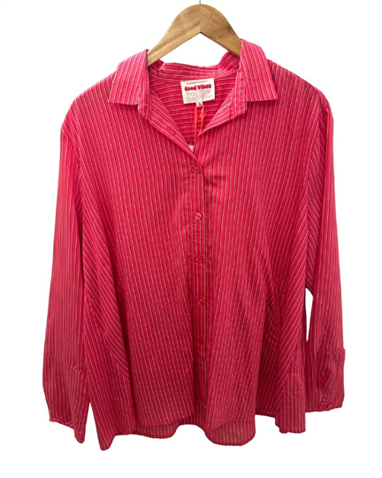 Leuke soepele roze wit rood gestreepte uitlopende blouse van The Shirt Project. Heel leuk als je hem voor iets in je broek of rok stopt.