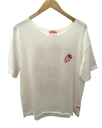 Fijn iets dikker ecru/wit t-shirt van The Shirt Project met achterop de tekst Dolce far Niente met aardbeien geborduurd.