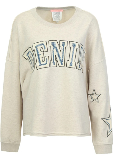 Hele leuke licht ecru grijs gemeleerde sweater van The Shirt Project met blauw en ecru geappliceerde letters DENIM voorop.
